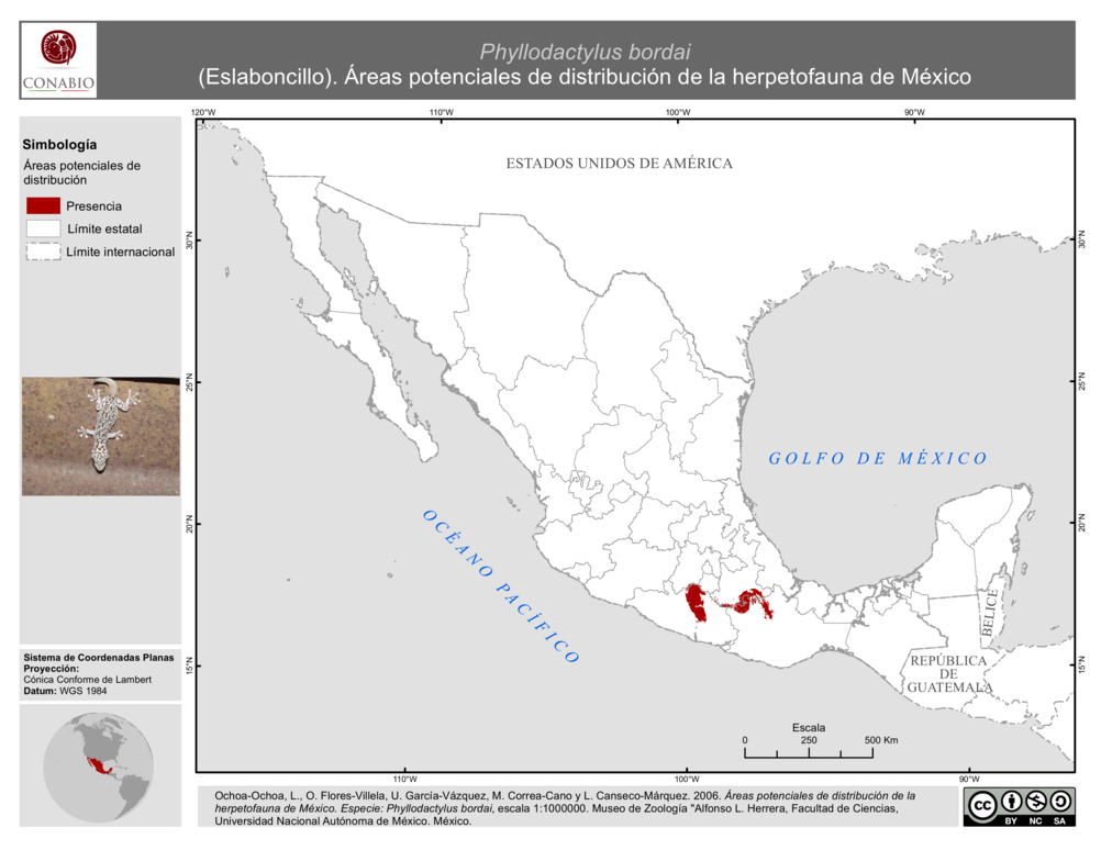 - Ochoa-Ochoa, L., O. Flores-Villela, U. García-Vázquez, M. Correa-Cano, L. Canseco-Márquez, (2006). 'Phyllodactylus bordai (Eslaboncillo). Área de distribución potencial', escala: 1:1000000. Museo de Zoología 'Alfonso L. Herrera', Facultad de Ciencias, Universidad Nacional Autónoma de México. Proyecto: DS009, Extraído del proyecto DS009: Áreas potenciales de distribución y GAP análisis de la herpetofauna de México. El proyecto fue financiado por la Comisión Nacional para el Conocimiento y Uso de la Biodiversidad (CONABIO). México.