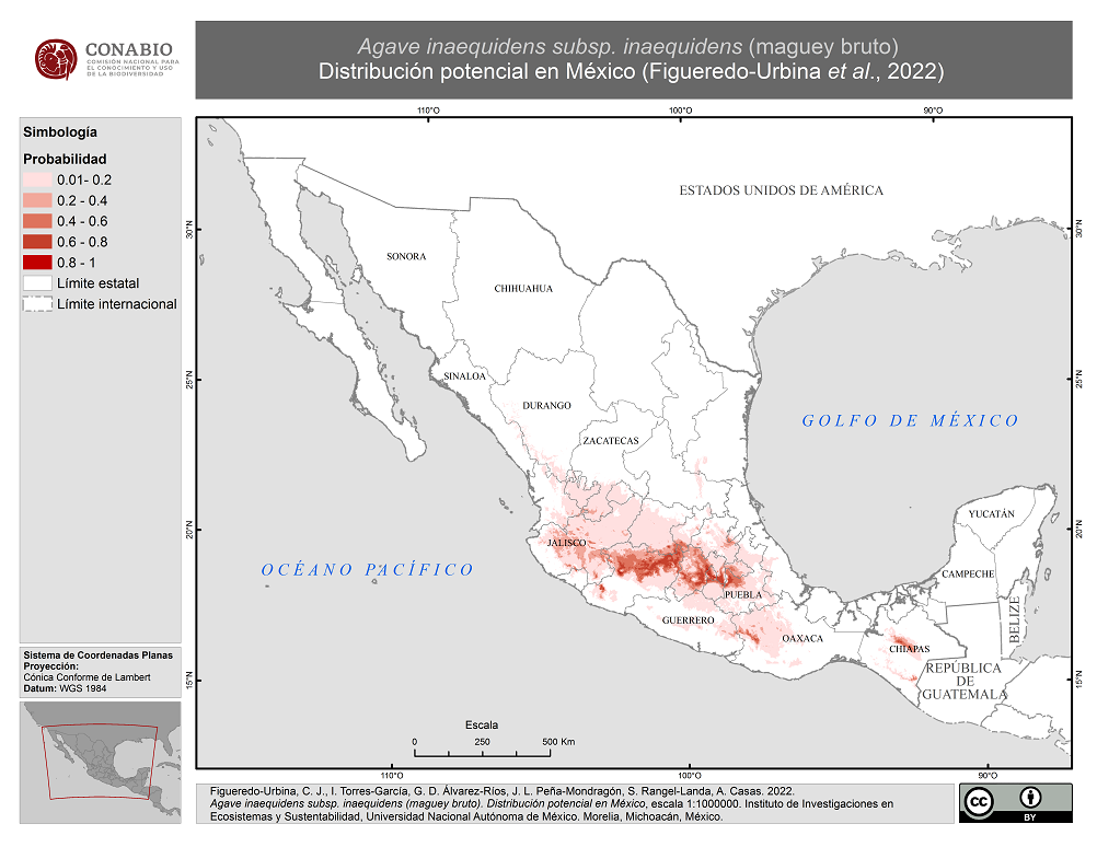 - Figueredo-Urbina, C. J., I. Torres-García, G. D. Álvarez-Ríos, J. L. Peña-Mondragón, S. Rangel-Landa, A. Casas, (23/06/2022). 'Agave inaequidens subsp. inaequidens (maguey bruto). Distribución potencial en México', escala: 1:1000000. edición: 1. Instituto de Investigaciones en Ecosistemas y Sustentabilidad. Universidad Nacional Autónoma de México. Proyecto: RG023, Manejo y domesticación de agrobiodiversidad en Mesoamérica: Bases para la soberanía alimentaria sustentable. El Proyecto fue financiado por la Comisión Nacional para el Conocimiento y Uso de la Biodiversidad (CONABIO). Morelia, Michoacán. México.