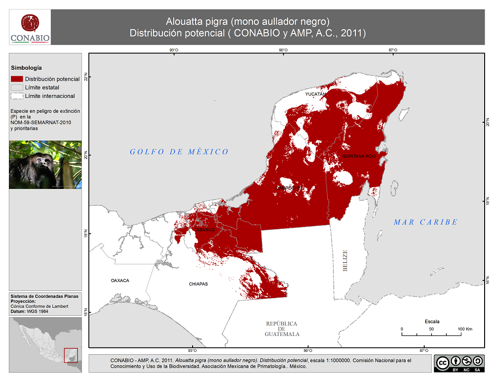 - México resguarda la distribución más norteña de primates no humanos en el Neotrópico, representada por dos especies del género Alouatta (A. palliata mexicana y A. pigra) y por dos subespecies del género Ateles (A. geoffroyi vellerosus y A. geoffroyi yucatanensis). Estos primates son considerados como especies prioritarias para la conservación en el país, debido a que están amenazados por la pérdida, fragmentación y degradación de su hábitat, la caza furtiva y el comercio ilegal, dado que desempeñan una importante función en la regeneración de los ecosistemas y a su importancia estratégica para la conservación de hábitats y de otras especies. Con el fin de orientar y promover de manera más efectiva las acciones de conservación in situ en México para estas especies carismáticas, la Comisión Nacional para el Conocimiento y Uso de la Biodiversidad (Conabio) y la Asociación Mexicana de Primatología, A.C. (AMP-A.C.) firmaron en junio del 2011 un convenio de colaboración para identificar los sitios prioritarios para su conservación mediante el uso de herramientas de planeación sistemática. Uno de los insumos principales para este análisis fueron los modelos de distribución potencial, los cuales se basan en el concepto de nicho ecológico, es decir en identificar zonas en donde las condiciones ambientales son similares a aquellas en las que se ha registrado la presencia de las especies. La distribución potencial del mono aullador negro (Alouatta pigra) ocupa 131,219.6 km2 y se concentra en la Península de Yucatán.