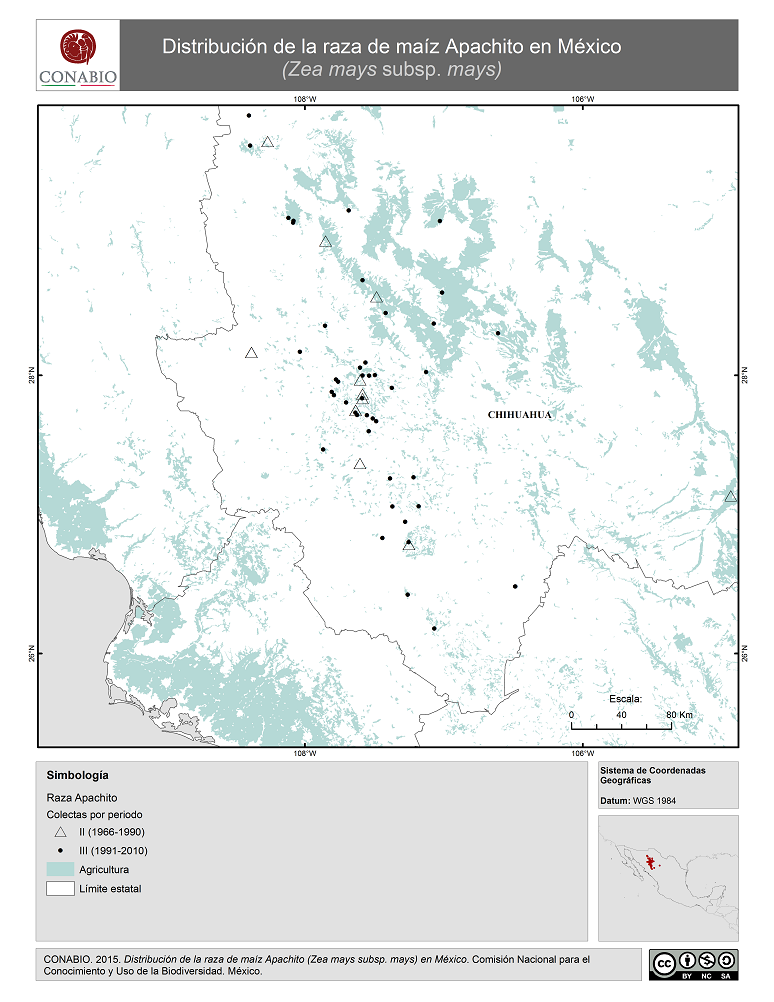 - CONABIO, (2015). 'Apachito en México. Distribución de la raza de maíz', escala: 1:1. Comisión Nacional para el Conocimiento y Uso de la Biodiversidad. Datos obtenidos del Proyecto Global de Maíces Nativos.. México, D.F..