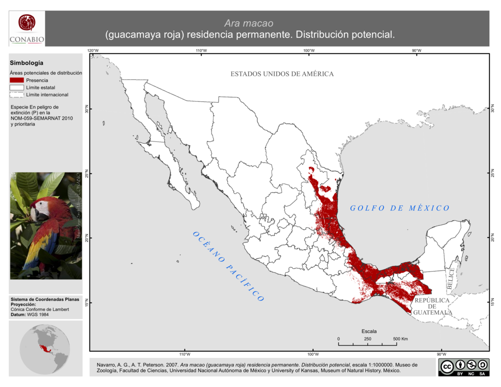 - Navarro-Sigüenza, A. G., A. T. Peterson, (2007). 'Ara macao (guacamaya roja). Distribución potencial', escala: 1:1000000. Proyecto: CE015, Extraído del proyecto CE015: Mapas de las aves de México basados en Web. Museo de Zoología, Facultad de Ciencias, UNAM y Museum of Natural History, University of Kansas. México. El proyecto fue financiado por la Comisión Nacional para el Conocimiento y Uso de la Biodiversidad (CONABIO). México.