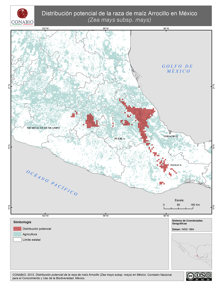 - CONABIO, (2015). 'Arrocillo en México. Distribución potencial de la raza de maíz', Comisión Nacional para el Conocimiento y Uso de la Biodiversidad. Se realizó el mapa de distribución de la raza de maíz Arrocillo de México, a partir de modelos de distribución potencial realizados por Perales y Golicher en 2011. Dichos modelos fueron generados a partir de los resultados del Proyecto Global de Maíces Nativos, que fue coordinado por la CONABIO junto con el Instituto Nacional de Investigaciones Forestales, Agrícolas y Pecuarias (INIFAP) y el Instituto Nacional de Ecología, ahora Instituto Nacional de Ecología y Cambio Climatico (INECC).. México, D.F..