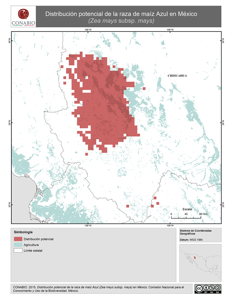 - CONABIO, (2015). 'Azul en México. Distribución potencial de la raza de maíz', Comisión Nacional para el Conocimiento y Uso de la Biodiversidad. Se realizó el mapa de distribución de la raza de maíz Azul de México, a partir de modelos de distribución potencial realizados por Perales y Golicher en 2011. Dichos modelos fueron generados a partir de los resultados del Proyecto Global de Maíces Nativos, que fue coordinado por la CONABIO junto con el Instituto Nacional de Investigaciones Forestales, Agrícolas y Pecuarias (INIFAP) y el Instituto Nacional de Ecología, ahora Instituto Nacional de Ecología y Cambio Climatico (INECC).. México, D.F..