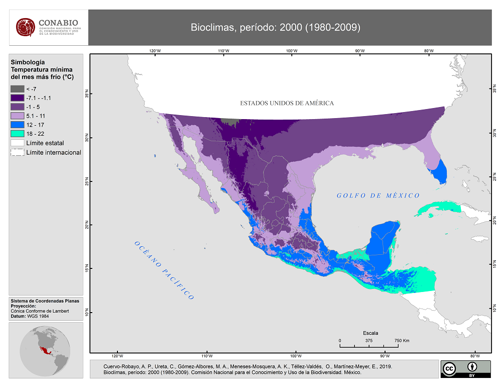 - Cuervo-Robayo A.P., C. Ureta, M.A. Gómez-Albores, A.K. Meneses-Mosquera, O. Téllez-Valdés, E. Martínez-Meyer, (27/08/2019). 'Bioclimas, periodo: 2000 (1980-2009)', edición: 1. Instituto de Biología, Universidad Nacional Autónoma de México. Estos mapas forman parte de la publicación: Cuervo-Robayo, A. P., Ureta, C., Gómez-Albores, M. A., Meneses-Mosquera, A. K., Téllez-Valdés, O., y E. Martínez-Meyer. (2020). One hundred years of climate change in Mexico. Plos One. https://doi.org/10.1371/journal.pone.0209808 Ciudad de México, México.