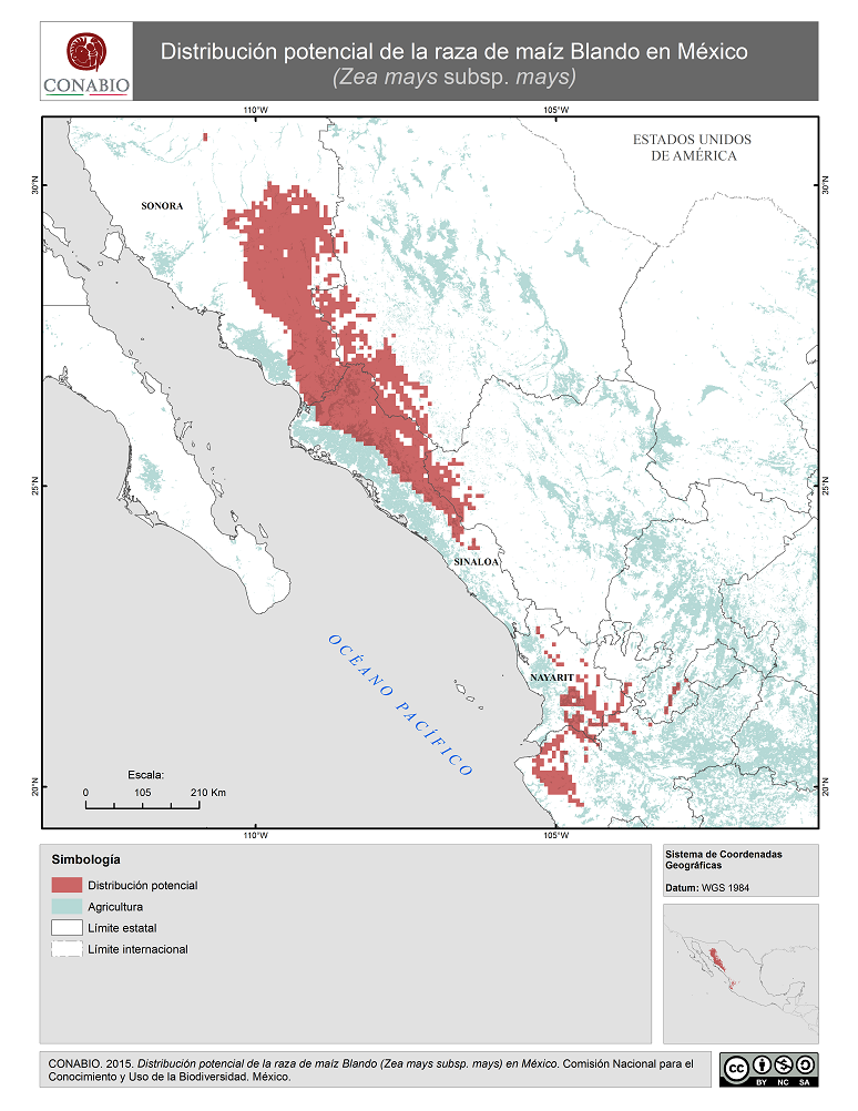 - CONABIO, (2015). 'Blando en México. Distribución potencial de la raza de maíz', Comisión Nacional para el Conocimiento y Uso de la Biodiversidad. Se realizó el mapa de distribución de la raza de maíz Blando de México, a partir de modelos de distribución potencial realizados por Perales y Golicher en 2011. Dichos modelos fueron generados a partir de los resultados del Proyecto Global de Maíces Nativos, que fue coordinado por la CONABIO junto con el Instituto Nacional de Investigaciones Forestales, Agrícolas y Pecuarias (INIFAP) y el Instituto Nacional de Ecología, ahora Instituto Nacional de Ecología y Cambio Climatico (INECC).. México, D.F..