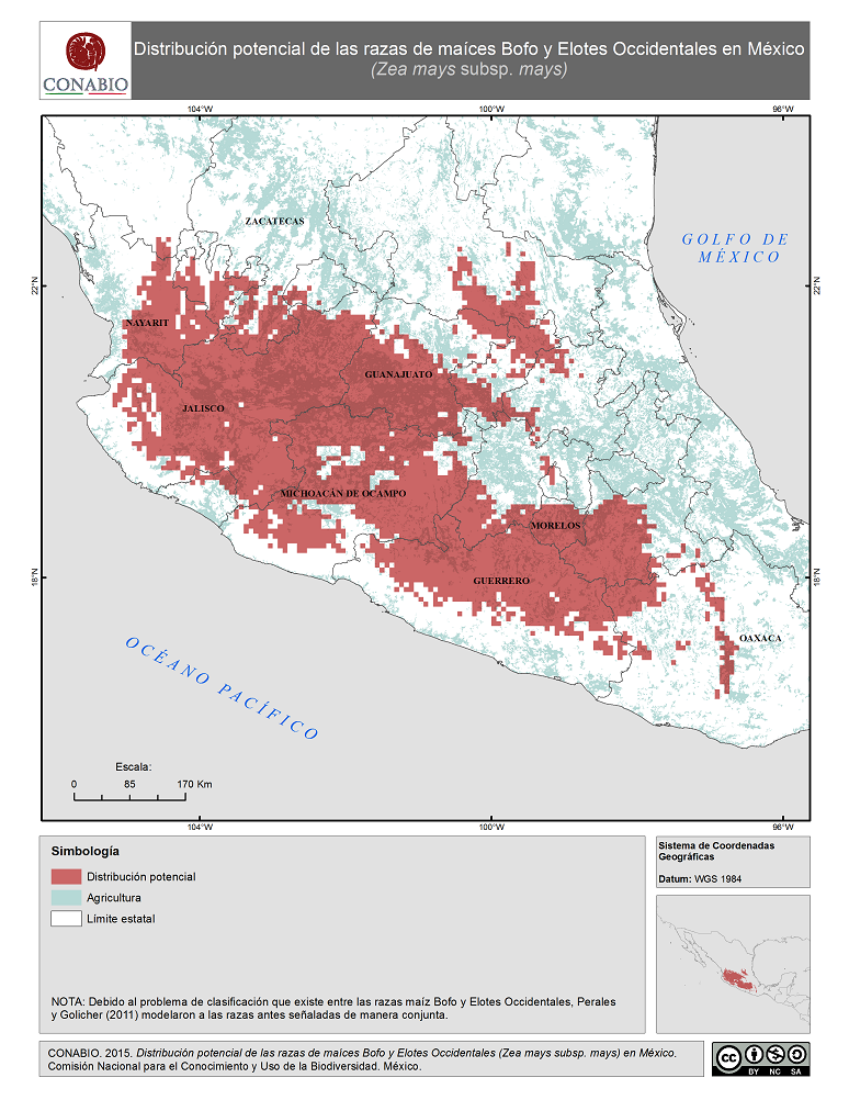 - CONABIO, (2015). 'Bofo y Elotes Occidentales en México. Distribución potencial de la raza de maíz', Comisión Nacional para el Conocimiento y Uso de la Biodiversidad. Se realizó el mapa de distribución de la raza de maíz Bofo y Elotes Occidentales de México, a partir de modelos de distribución potencial realizados por Perales y Golicher en 2011. Dichos modelos fueron generados a partir de los resultados del Proyecto Global de Maíces Nativos, que fue coordinado por la CONABIO junto con el Instituto Nacional de Investigaciones Forestales, Agrícolas y Pecuarias (INIFAP) y el Instituto Nacional de Ecología, ahora Instituto Nacional de Ecología y Cambio Climatico (INECC).. México, D.F..