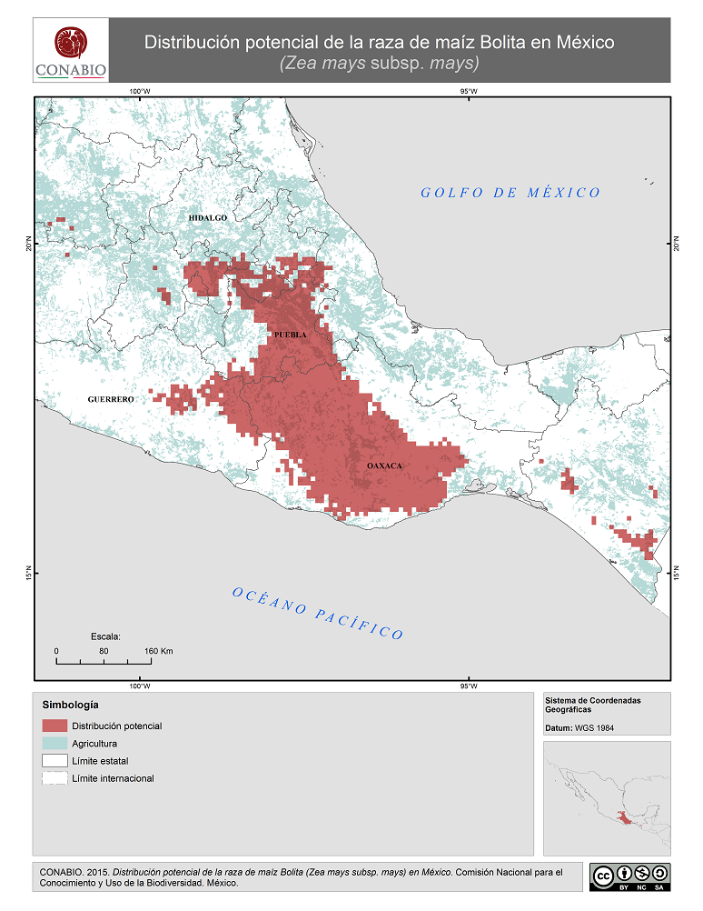 - CONABIO, (2015). 'Bolita en México. Distribución potencial de la raza de maíz', Comisión Nacional para el Conocimiento y Uso de la Biodiversidad. Se realizó el mapa de distribución de la raza de maíz Bolita de México, a partir de modelos de distribución potencial realizados por Perales y Golicher en 2011. Dichos modelos fueron generados a partir de los resultados del Proyecto Global de Maíces Nativos, que fue coordinado por la CONABIO junto con el Instituto Nacional de Investigaciones Forestales, Agrícolas y Pecuarias (INIFAP) y el Instituto Nacional de Ecología, ahora Instituto Nacional de Ecología y Cambio Climatico (INECC).. México, D.F..