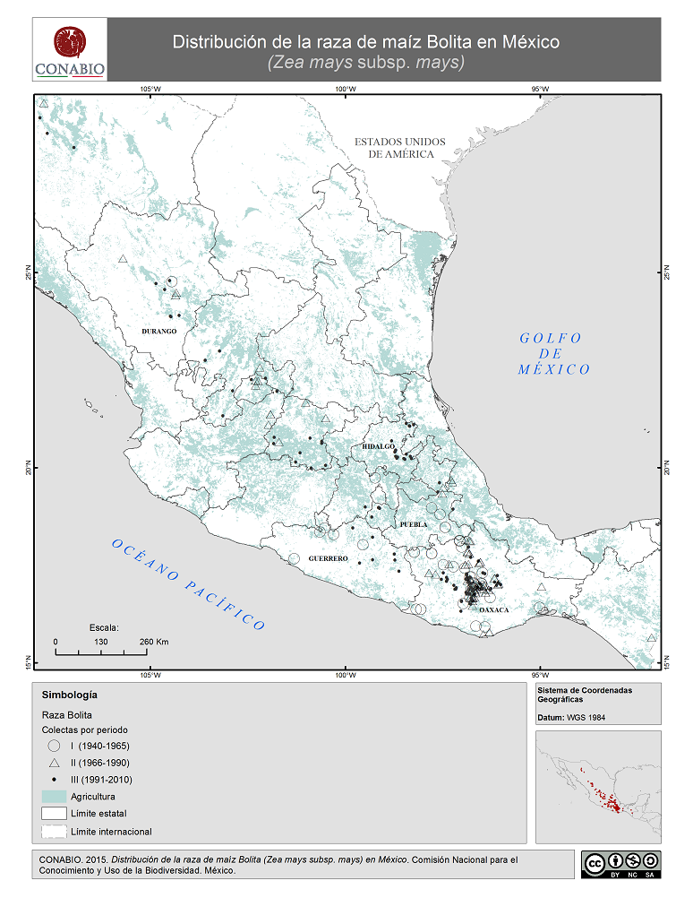 - CONABIO, (2015). 'Bolita en México. Distribución de la raza de maíz', escala: 1:1. Comisión Nacional para el Conocimiento y Uso de la Biodiversidad. Datos obtenidos del Proyecto Global de Maíces Nativos.. México, D.F..