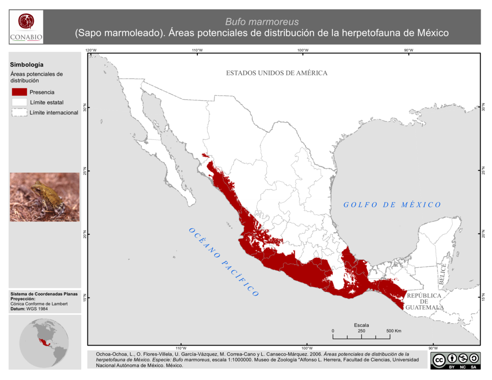 - Ochoa-Ochoa, L., M. Correa-Cano, O. Flores-Villela, U. García-Vázquez, L. Canseco-Márquez, (2006). 'Bufo marmoreus (Sapo marmoleado). Área de distribución potencial', escala: 1:1000000. Museo de Zoología 'Alfonso L. Herrera', Facultad de Ciencias, Universidad Nacional Autónoma de México. Proyecto: DS009, Extraído del proyecto DS009: Áreas potenciales de distribución y GAP análisis de la herpetofauna de México. El proyecto fue financiado por la Comisión Nacional para el Conocimiento y Uso de la Biodiversidad (CONABIO). México.