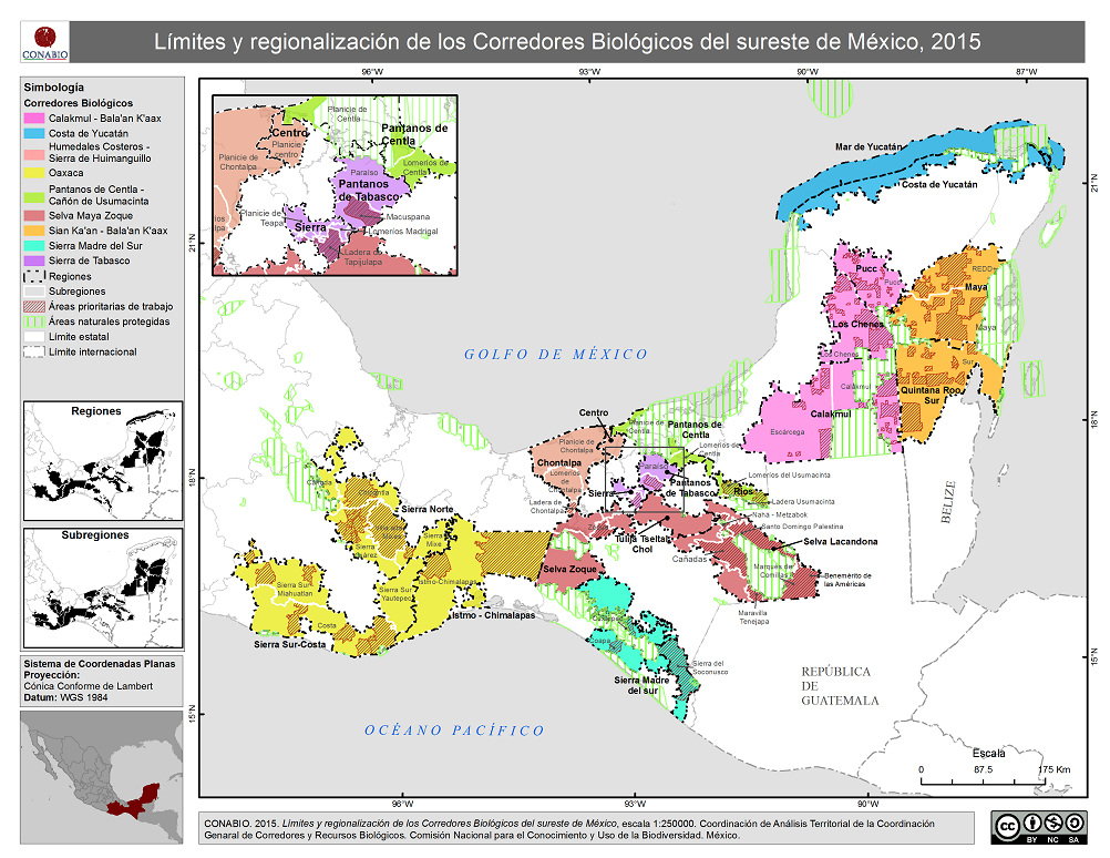 - Coordinación de Análisis Territorial, (15/12/2015). 'Límites y regionalización de los Corredores Biológicos del sureste de México, 2015', escala: 1:250000. edición: 2. Comisión Nacional para el Conocimiento y Uso de la Biodiversidad. Actualización de los límites de los corredores biológicos del sureste de México, regionalización anidada en tres niveles, identificación de áreas de trabajo.. México, D.F..