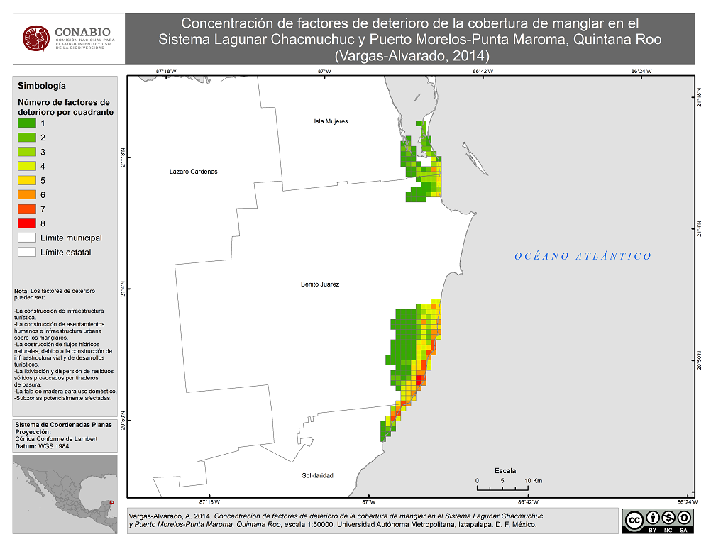 - Concentración de factores de deterioro de la cobertura de manglar en el Sistema Lagunar Chacmuchuc y Puerto Morelos-Punta Maroma, Quintana Roo (Vargas-Alvarado, 2014)