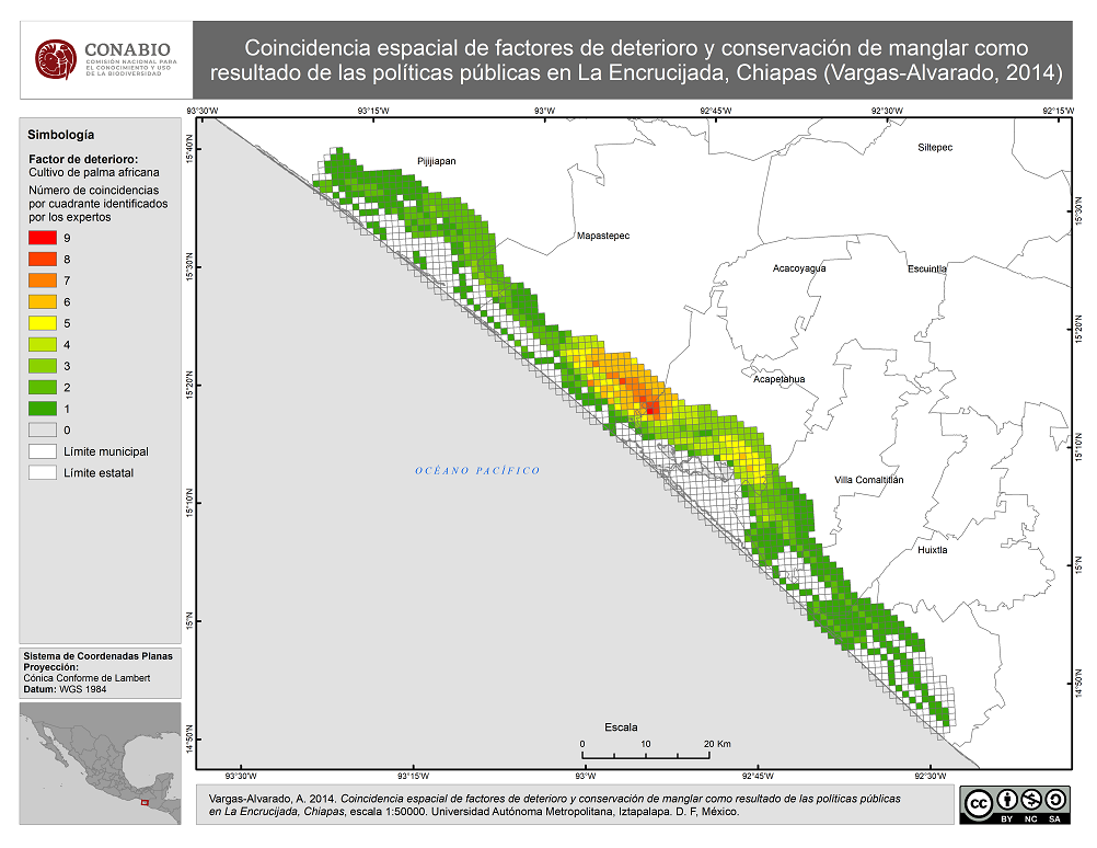 - Vargas-Alvarado, A., (10/07/2014). 'Coincidencia espacial de factores de deterioro y conservación de manglar como resultado de las políticas públicas en La Encrucijada, Chiapas.', escala: 1:50000. edición: 1. Unidad Iztapalapa, Universidad Autónoma Metropolitana. Proyecto: KE010, Análisis de las consecuencias de la política pública en el contexto de la conservación de los manglares: los casos de La Palma/Mecoacán (Tabasco), La Encrucijada (Chiapas), Punta Maroma/Chacmuchuc (Quintana Roo) y Agua Dulce/El Ermitaño (Jalisco). El Proyecto fue financiado por la Comisión Nacional para el Conocimiento y Uso de la Biodiversidad (CONABIO). México D.F.