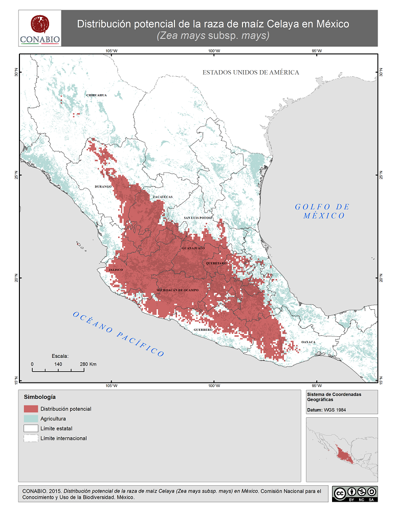 - CONABIO, (2015). 'Celaya en México. Distribución potencial de la raza de maíz', Comisión Nacional para el Conocimiento y Uso de la Biodiversidad. Se realizó el mapa de distribución de la raza de maíz Celaya de México, a partir de modelos de distribución potencial realizados por Perales y Golicher en 2011. Dichos modelos fueron generados a partir de los resultados del Proyecto Global de Maíces Nativos, que fue coordinado por la CONABIO junto con el Instituto Nacional de Investigaciones Forestales, Agrícolas y Pecuarias (INIFAP) y el Instituto Nacional de Ecología, ahora Instituto Nacional de Ecología y Cambio Climatico (INECC).. México, D.F..