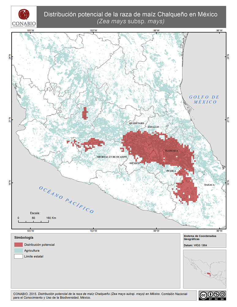- CONABIO, (2015). 'Chalqueño en México. Distribución potencial de la raza de maíz', Comisión Nacional para el Conocimiento y Uso de la Biodiversidad. Se realizó el mapa de distribución de la raza de maíz Chalqueño de México, a partir de modelos de distribución potencial realizados por Perales y Golicher en 2011. Dichos modelos fueron generados a partir de los resultados del Proyecto Global de Maíces Nativos, que fue coordinado por la CONABIO junto con el Instituto Nacional de Investigaciones Forestales, Agrícolas y Pecuarias (INIFAP) y el Instituto Nacional de Ecología, ahora Instituto Nacional de Ecología y Cambio Climatico (INECC).. México, D.F..