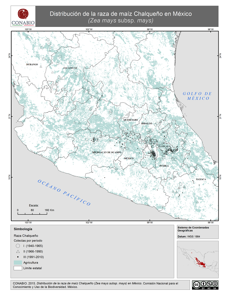 - CONABIO, (2015). 'Chalqueño en México. Distribución de la raza de maíz', escala: 1:1. Comisión Nacional para el Conocimiento y Uso de la Biodiversidad. Datos obtenidos del Proyecto Global de Maíces Nativos.. México, D.F..
