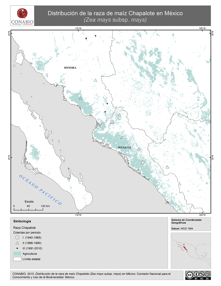 - CONABIO, (2015). 'Chapalote en México. Distribución de la raza de maíz', escala: 1:1. Comisión Nacional para el Conocimiento y Uso de la Biodiversidad. Datos obtenidos del Proyecto Global de Maíces Nativos.. México, D.F..