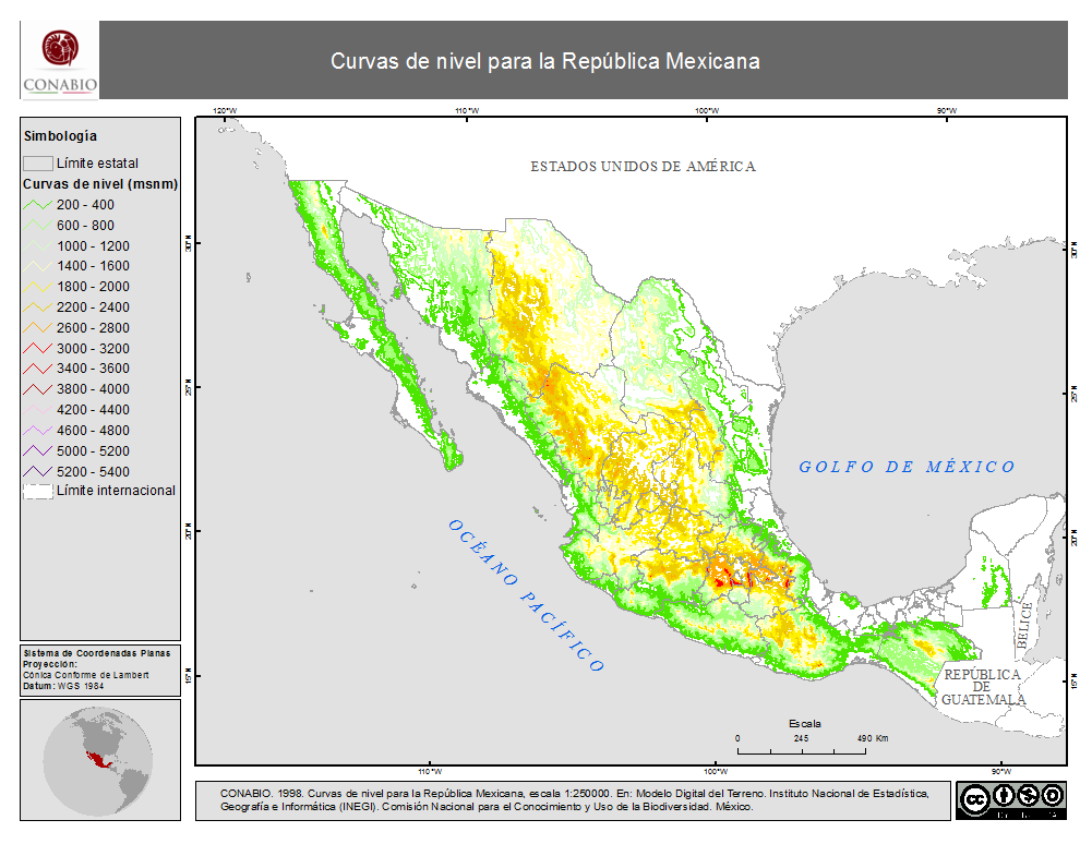 - Este mapa presenta las curvas de nivel del país cada 200 metros; extraído del Modelo Digital del Terreno escala 1:250000 de INEGI.