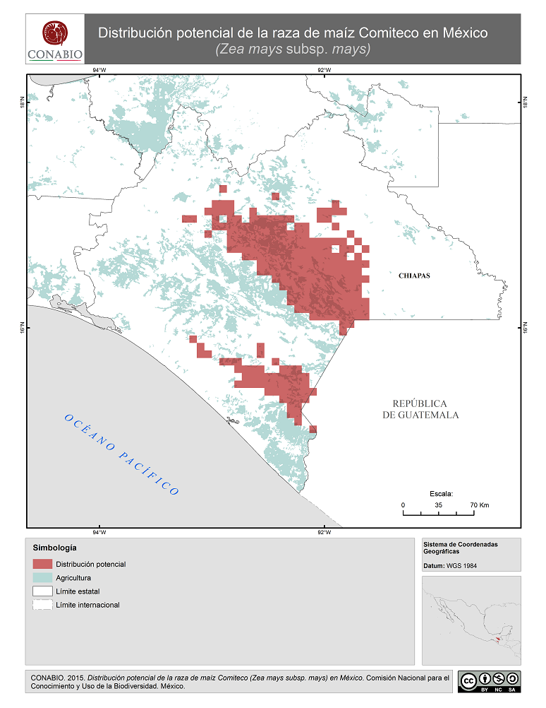- CONABIO, (2015). 'Comiteco en México. Distribución potencial de la raza de maíz', Comisión Nacional para el Conocimiento y Uso de la Biodiversidad. Se realizó el mapa de distribución de la raza de maíz Comiteco de México, a partir de modelos de distribución potencial realizados por Perales y Golicher en 2011. Dichos modelos fueron generados a partir de los resultados del Proyecto Global de Maíces Nativos, que fue coordinado por la CONABIO junto con el Instituto Nacional de Investigaciones Forestales, Agrícolas y Pecuarias (INIFAP) y el Instituto Nacional de Ecología, ahora Instituto Nacional de Ecología y Cambio Climatico (INECC).. México, D.F..