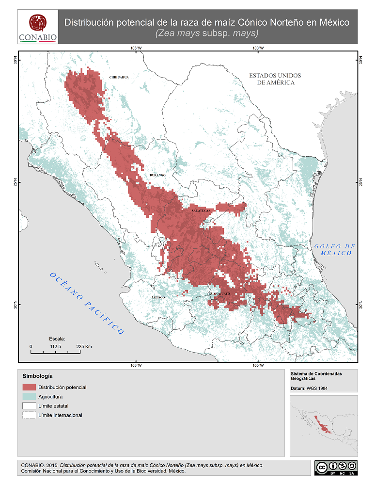 - CONABIO, (2015). 'Cónico Norteño en México. Distribución potencial de la raza de maíz', Comisión Nacional para el Conocimiento y Uso de la Biodiversidad. Se realizó el mapa de distribución de la raza de maíz Cónico Norteño de México, a partir de modelos de distribución potencial realizados por Perales y Golicher en 2011. Dichos modelos fueron generados a partir de los resultados del Proyecto Global de Maíces Nativos, que fue coordinado por la CONABIO junto con el Instituto Nacional de Investigaciones Forestales, Agrícolas y Pecuarias (INIFAP) y el Instituto Nacional de Ecología, ahora Instituto Nacional de Ecología y Cambio Climatico (INECC).. México, D.F..