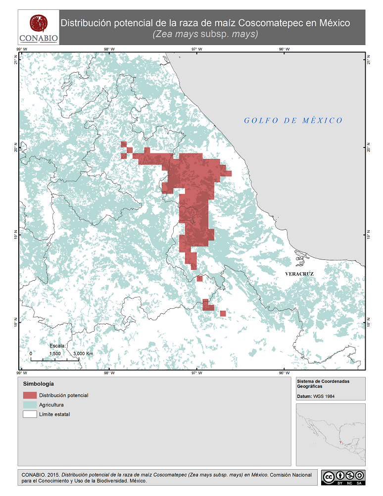 - CONABIO, (2015). 'Coscomatepec en México. Distribución potencial de la raza de maíz', Comisión Nacional para el Conocimiento y Uso de la Biodiversidad. Se realizó el mapa de distribución de la raza de maíz Coscomatepec de México, a partir de modelos de distribución potencial realizados por Perales y Golicher en 2011. Dichos modelos fueron generados a partir de los resultados del Proyecto Global de Maíces Nativos, que fue coordinado por la CONABIO junto con el Instituto Nacional de Investigaciones Forestales, Agrícolas y Pecuarias (INIFAP) y el Instituto Nacional de Ecología, ahora Instituto Nacional de Ecología y Cambio Climatico (INECC).. México, D.F..