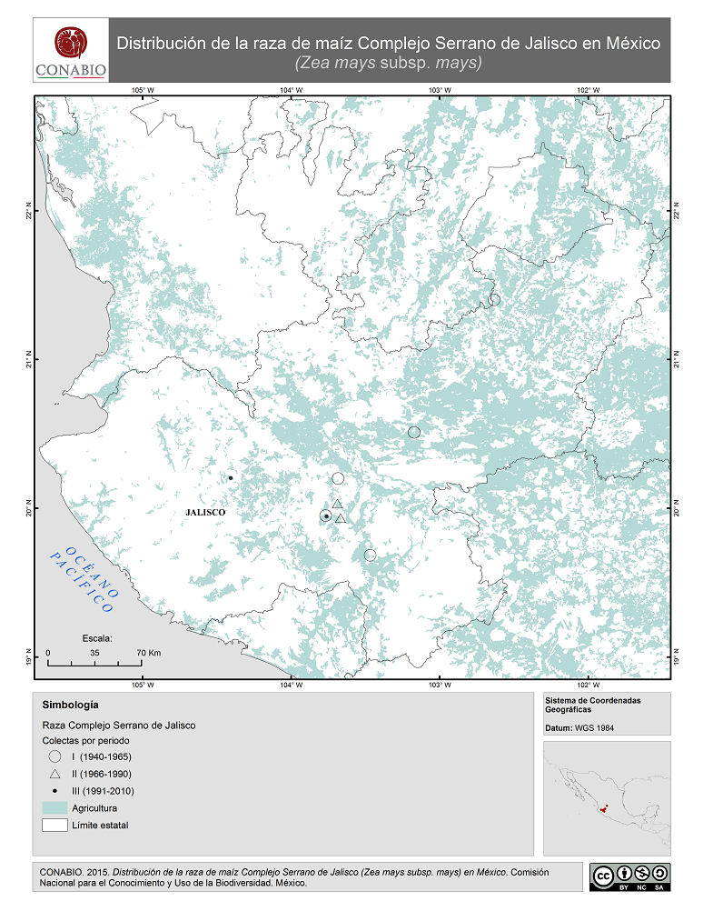 - CONABIO, (2015). 'Complejo Serrano de Jalisco en México. Distribución de la raza de maíz', escala: 1:1. Comisión Nacional para el Conocimiento y Uso de la Biodiversidad. Datos obtenidos del Proyecto Global de Maíces Nativos.. México, D.F..