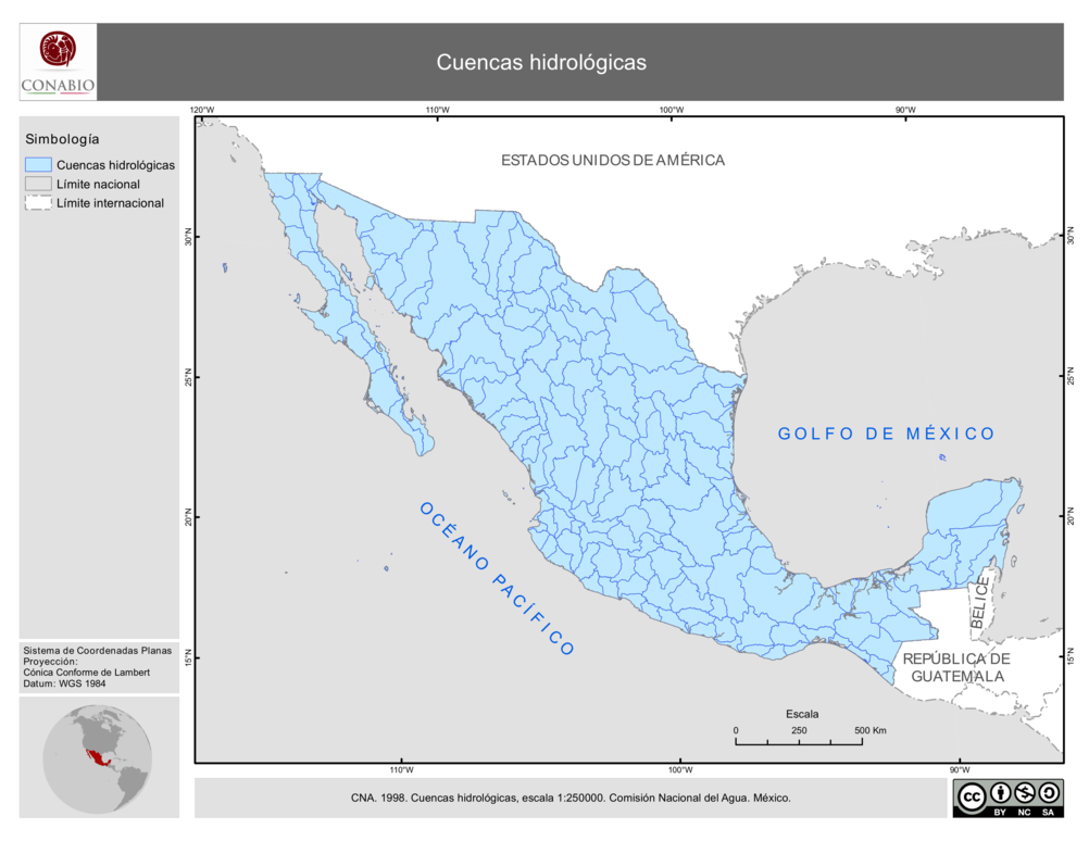 - Comisión Nacional del Agua (CNA), (1998). 'Cuencas Hidrológicas'. Escala 1:250000. México.
