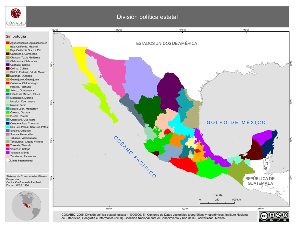 - Este mapa fue elaborado en CONABIO con información cartográfica proporcionada por el INEGI. El mapa contiene información sobre: nombres de los Estados y Capitales (según INEGI) e Islas. Las islas presentan el nombre del estado, que se encuentra enfrente de, lo cuál no significa que la administre. El mapa no presenta nombre de las islas.