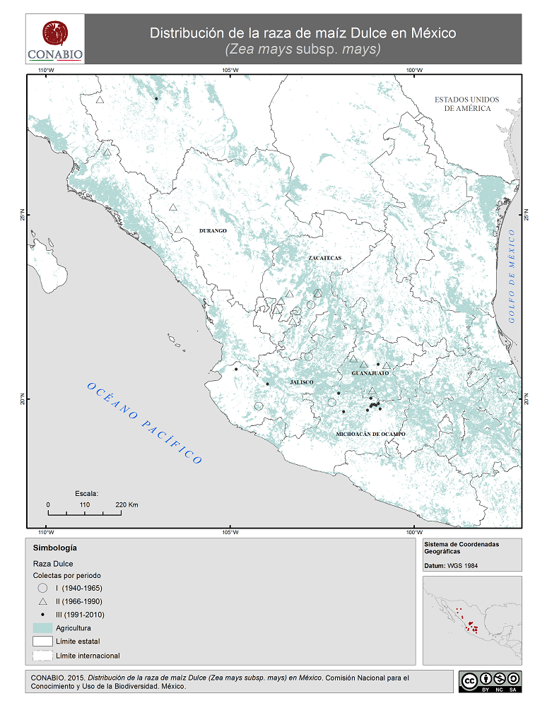 - CONABIO, (2015). 'Dulce en México. Distribución de la raza de maíz', escala: 1:1. Comisión Nacional para el Conocimiento y Uso de la Biodiversidad. Datos obtenidos del Proyecto Global de Maíces Nativos.. México, D.F..