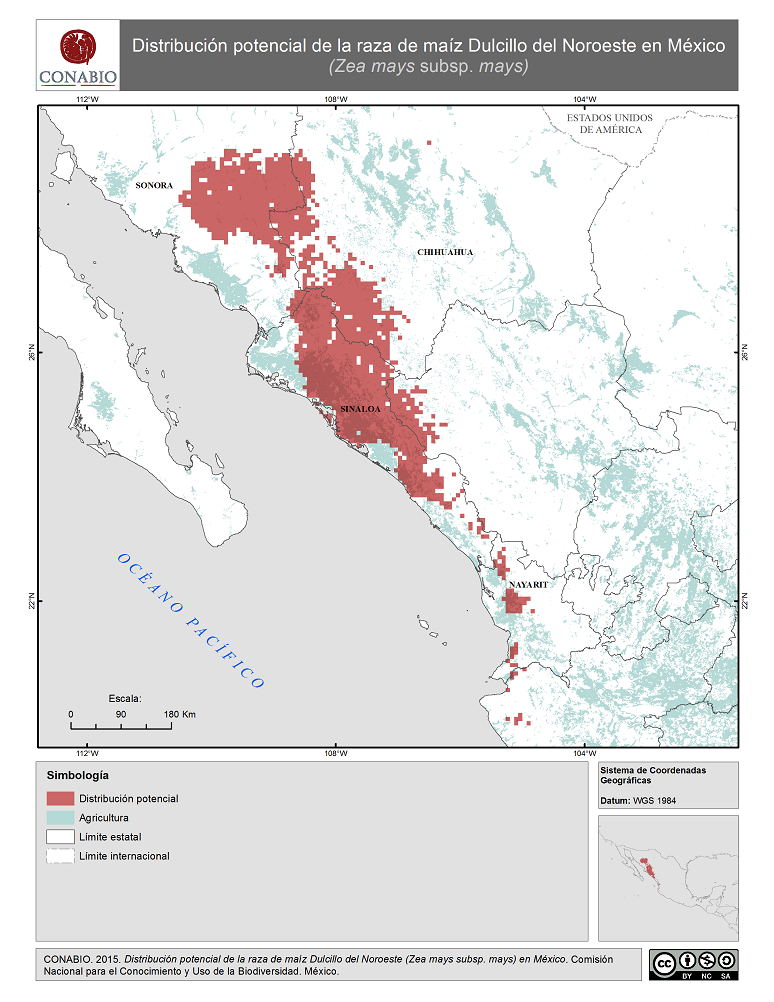 - CONABIO, (2015). 'Dulcillo del Noroeste en México. Distribución potencial de la raza de maíz', Comisión Nacional para el Conocimiento y Uso de la Biodiversidad. Se realizó el mapa de distribución de la raza de maíz Dulcillo del Noroeste de México, a partir de modelos de distribución potencial realizados por Perales y Golicher en 2011. Dichos modelos fueron generados a partir de los resultados del Proyecto Global de Maíces Nativos, que fue coordinado por la CONABIO junto con el Instituto Nacional de Investigaciones Forestales, Agrícolas y Pecuarias (INIFAP) y el Instituto Nacional de Ecología, ahora Instituto Nacional de Ecología y Cambio Climatico (INECC).. México, D.F..