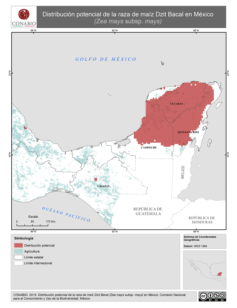 - CONABIO, (2015). 'Dzit Bacal en México. Distribución potencial de la raza de maíz', Comisión Nacional para el Conocimiento y Uso de la Biodiversidad. Se realizó el mapa de distribución de la raza de maíz Dzit Bacal de México, a partir de modelos de distribución potencial realizados por Perales y Golicher en 2011. Dichos modelos fueron generados a partir de los resultados del Proyecto Global de Maíces Nativos, que fue coordinado por la CONABIO junto con el Instituto Nacional de Investigaciones Forestales, Agrícolas y Pecuarias (INIFAP) y el Instituto Nacional de Ecología, ahora Instituto Nacional de Ecología y Cambio Climatico (INECC).. México, D.F..