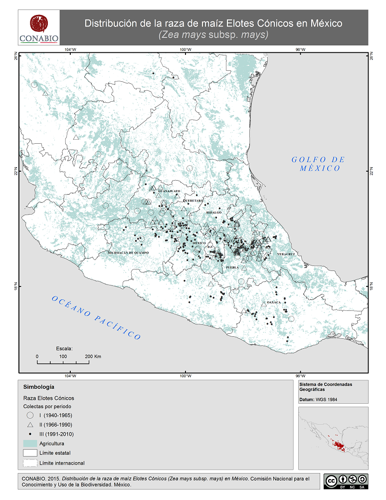 - CONABIO, (2015). 'Elotes Cónicos en México. Distribución de la raza de maíz', escala: 1:1. Comisión Nacional para el Conocimiento y Uso de la Biodiversidad. Datos obtenidos del Proyecto Global de Maíces Nativos.. México, D.F..