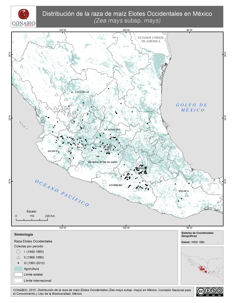 - CONABIO, (2015). 'Elotes Occidentales en México. Distribución de la raza de maíz', escala: 1:1. Comisión Nacional para el Conocimiento y Uso de la Biodiversidad. Datos obtenidos del Proyecto Global de Maíces Nativos.. México, D.F..