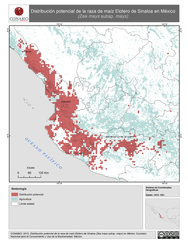 - CONABIO, (2015). 'Elotero de Sinaloa en México. Distribución potencial de la raza de maíz', Comisión Nacional para el Conocimiento y Uso de la Biodiversidad. Se realizó el mapa de distribución de la raza de maíz Elotero de Sinaloa de México, a partir de modelos de distribución potencial realizados por Perales y Golicher en 2011. Dichos modelos fueron generados a partir de los resultados del Proyecto Global de Maíces Nativos, que fue coordinado por la CONABIO junto con el Instituto Nacional de Investigaciones Forestales, Agrícolas y Pecuarias (INIFAP) y el Instituto Nacional de Ecología, ahora Instituto Nacional de Ecología y Cambio Climatico (INECC).. México, D.F..