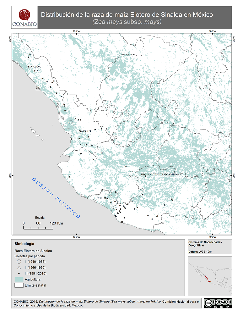 - CONABIO, (2015). 'Elotero de Sinaloa en México. Distribución de la raza de maíz', escala: 1:1. Comisión Nacional para el Conocimiento y Uso de la Biodiversidad. Datos obtenidos del Proyecto Global de Maíces Nativos.. México, D.F..