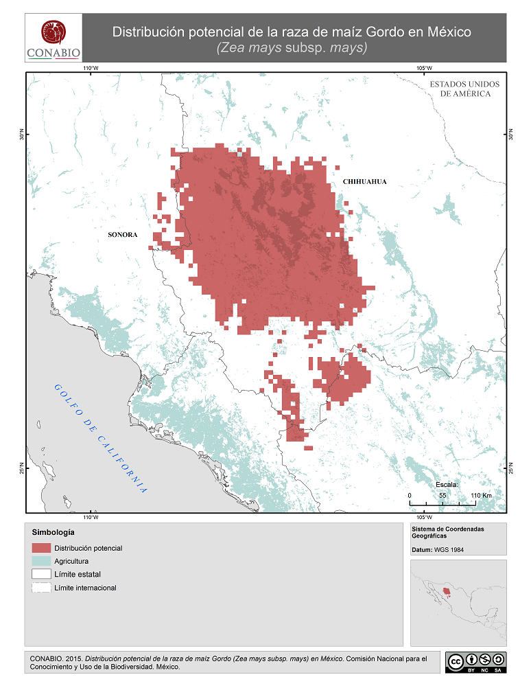 - CONABIO, (2015). 'Gordo en México. Distribución potencial de la raza de maíz', Comisión Nacional para el Conocimiento y Uso de la Biodiversidad. Se realizó el mapa de distribución de la raza de maíz Gordo de México, a partir de modelos de distribución potencial realizados por Perales y Golicher en 2011. Dichos modelos fueron generados a partir de los resultados del Proyecto Global de Maíces Nativos, que fue coordinado por la CONABIO junto con el Instituto Nacional de Investigaciones Forestales, Agrícolas y Pecuarias (INIFAP) y el Instituto Nacional de Ecología, ahora Instituto Nacional de Ecología y Cambio Climatico (INECC).. México, D.F..