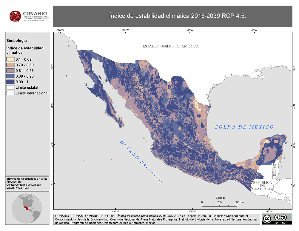 - CONABIO, (2019). 'Índice de estabilidad climática 2015-2039 RCP 4.5', escala: 1:250000. Comisión Nacional para el Conocimiento y Uso de la Biodiversidad. CONABIO, IB-UNAM, CONANP Y PNUD. 2019. Índice de estabilidad climática 2015-2039 RCP 4.5. Comisión Nacional para el Conocimiento y Uso de la Biodiversidad - Comisión Nacional de Áreas Naturales Protegidas - Instituto de Biología de la Universidad Nacional Autónoma de México - Programa de Naciones Unidas para el Medio Ambiente, México. Ciudad de México, México.