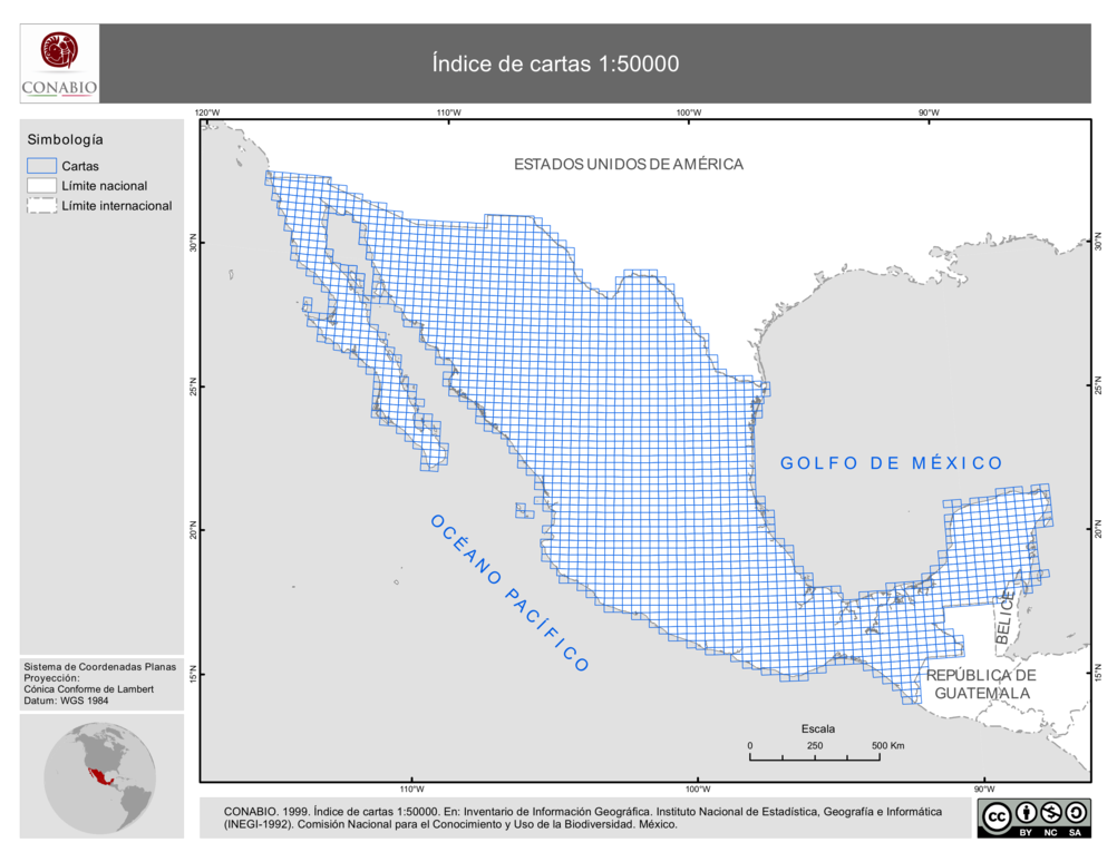 - Esta cobertura presenta el índice de las cartas impresas de INEGI escala 1:50 000. Con la clave de las cartas.
