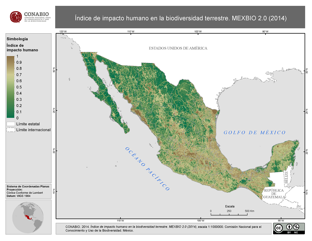 - CONABIO, (2019). 'Índice de impacto humano en la biodiversidad terrestre. MEXBIO 2.0 (2014)', escala: 1:1000000. Comisión Nacional para el Conocimiento y Uso de la Biodiversidad. Ciudad de México, México.