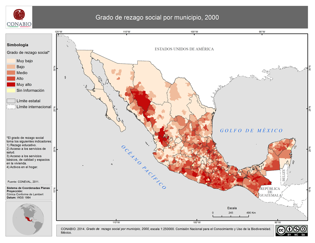 - CONABIO, (10/03/2014). 'Grado de rezago social por municipio, 2000', escala: 1:250000. Comisión Nacional para el Conocimiento y Uso de la Biodiversidad. México, D.F..