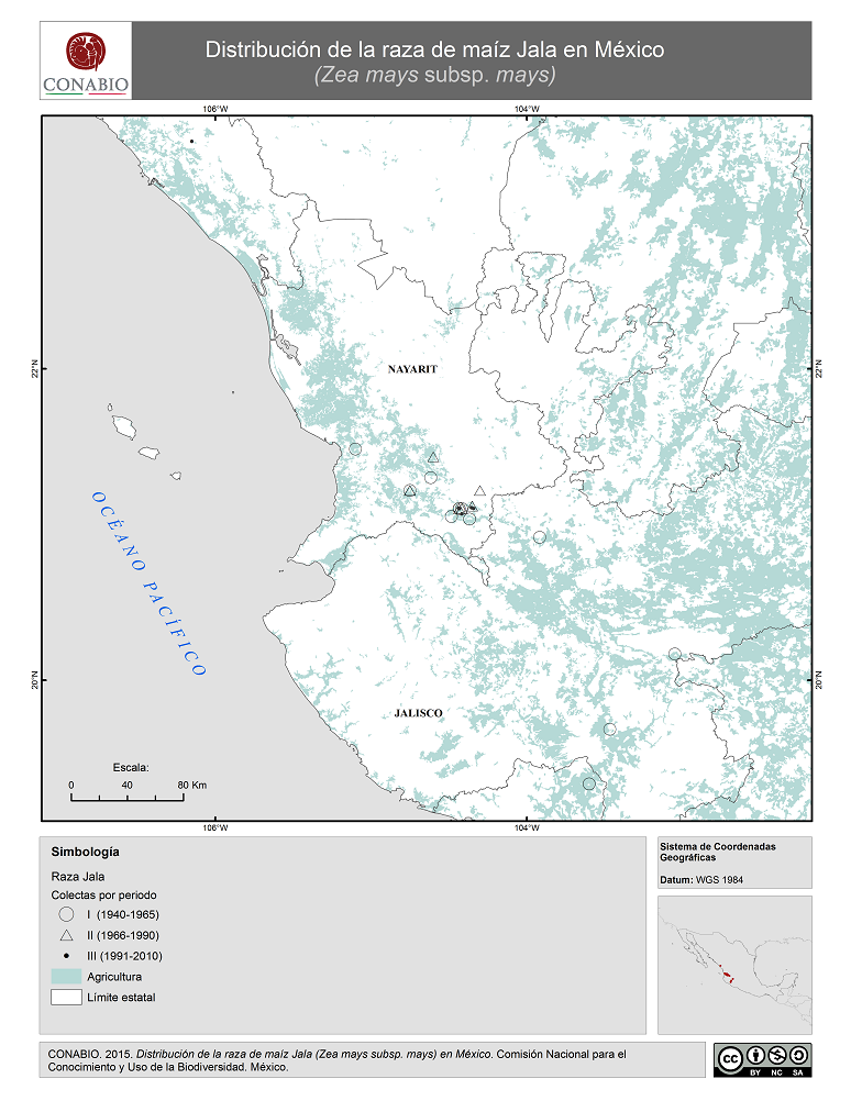 - CONABIO, (2015). 'Jala en México. Distribución de la raza de maíz', escala: 1:1. Comisión Nacional para el Conocimiento y Uso de la Biodiversidad. Datos obtenidos del Proyecto Global de Maíces Nativos.. México, D.F..