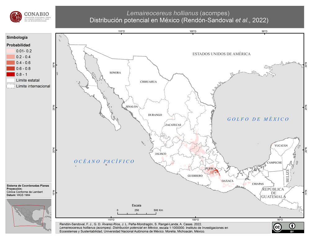 - Rendón-Sandoval, F. J., G. D. Álvarez-Ríos, J. L. Peña-Mondragón, S. Rangel-Landa, A. Casas, (23/06/2022). 'Lemaireocereus hollianus (acompes). Distribución potencial en México', escala: 1:1000000. edición: 1. Instituto de Investigaciones en Ecosistemas y Sustentabilidad. Universidad Nacional Autónoma de México. Proyecto: RG023, Manejo y domesticación de agrobiodiversidad en Mesoamérica: Bases para la soberanía alimentaria sustentable. El Proyecto fue financiado por la Comisión Nacional para el Conocimiento y Uso de la Biodiversidad (CONABIO). Morelia, Michoacán. México.