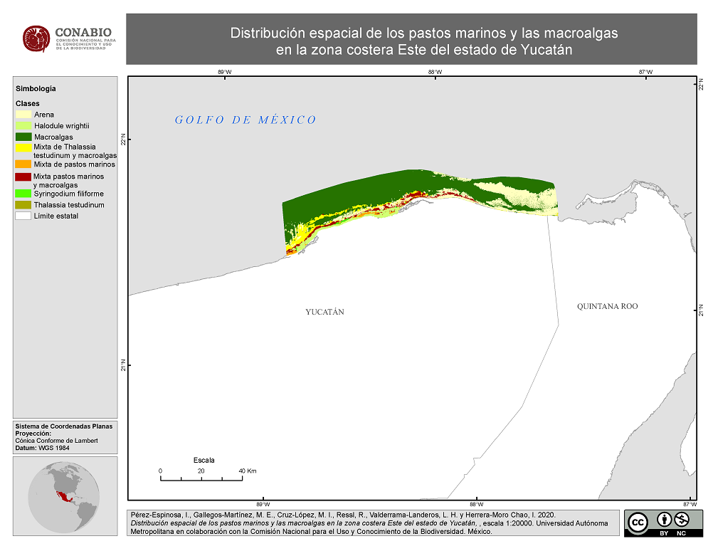 - Pérez-Espinosa, I., Gallegos-Martínez, M., Cruz-López, M. I.,, Ressl, R., Valderrama-Landeros, L. H., Herrera-Moro Chao, I, (23/06/2020). 'Distribución espacial de los pastos marinos y las macroalgas en la zona costera Este del estado de Yucatán', escala: 1:20000. edición: 1. Universidad Autónoma Metropolitana Unidad Iztapalapa. Ciudad de México, México.