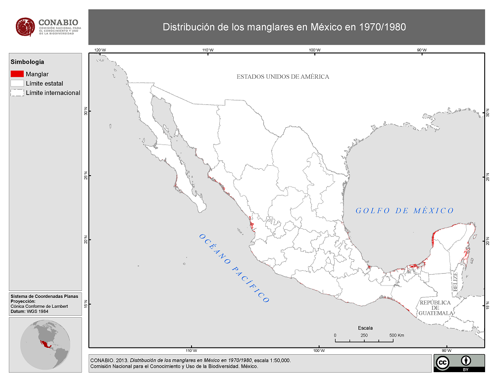 - CONABIO, (2013). 'Distribución de los manglares en México en 1970/1980', escala: 1:50000. edición: 1. Comisión Nacional para el Conocimiento y Uso de la Biodiversidad. Proyecto: GQ004, Los manglares de México: Estado actual y establecimiento de un programa de monitoreo a largo plazo: 2da y 3era etapas.. México, DF.