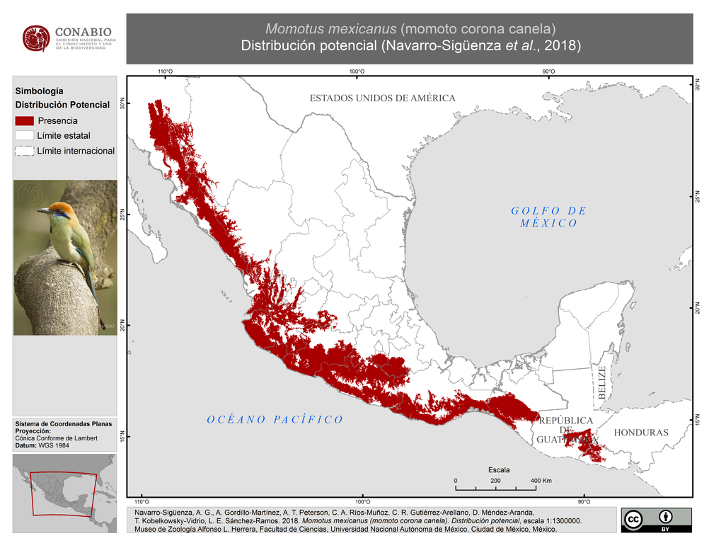 - Navarro-Sigüenza, A. G., A. Gordillo-Martínez, A. T. Peterson, C. A. Ríos-Muñoz, C. R. Gutiérrez-Arellano, D. Méndez-Aranda, T. Kobelkowsky-Vidrio, L. E. Sánchez-Ramos, (2018). 'Momotus mexicanus (momoto corona canela). Distribución potencial.', escala: 1:1300000. edición: 1. Museo de Zoología Alfonso L. Herrera, Facultad de Ciencias, Universidad Nacional Autónoma de México. Proyecto: JM071, Mapas de distribución de las aves terrestres nativas de Mesoamérica. El Proyecto fue financiado por la Comisión Nacional para el Conocimiento y Uso de la Biodiversidad (CONABIO).. Ciudad de México, México..