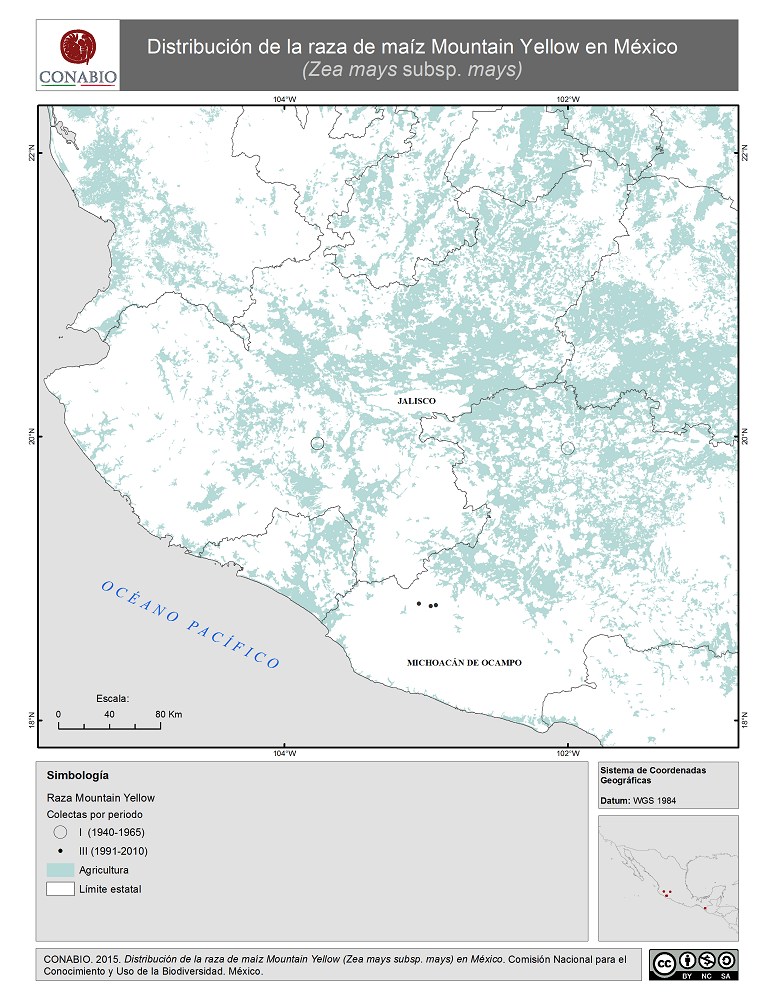 - CONABIO, (2015). 'Mountain Yellow en México. Distribución de la raza de maíz', escala: 1:1. Comisión Nacional para el Conocimiento y Uso de la Biodiversidad. Datos obtenidos del Proyecto Global de Maíces Nativos.. México, D.F..