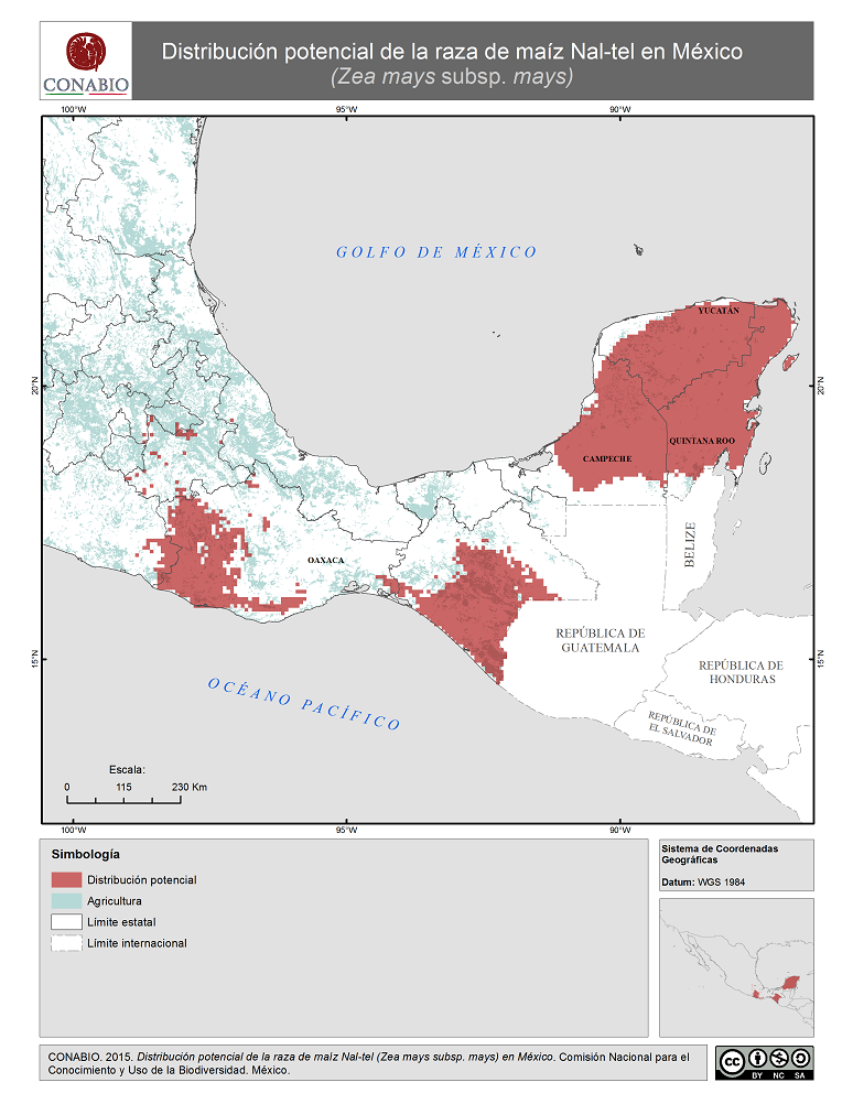 - CONABIO, (2015). 'Nal-tel en México. Distribución potencial de la raza de maíz', Comisión Nacional para el Conocimiento y Uso de la Biodiversidad. Se realizó el mapa de distribución de la raza de maíz Nal-tel de México, a partir de modelos de distribución potencial realizados por Perales y Golicher en 2011. Dichos modelos fueron generados a partir de los resultados del Proyecto Global de Maíces Nativos, que fue coordinado por la CONABIO junto con el Instituto Nacional de Investigaciones Forestales, Agrícolas y Pecuarias (INIFAP) y el Instituto Nacional de Ecología, ahora Instituto Nacional de Ecología y Cambio Climatico (INECC).. México, D.F..