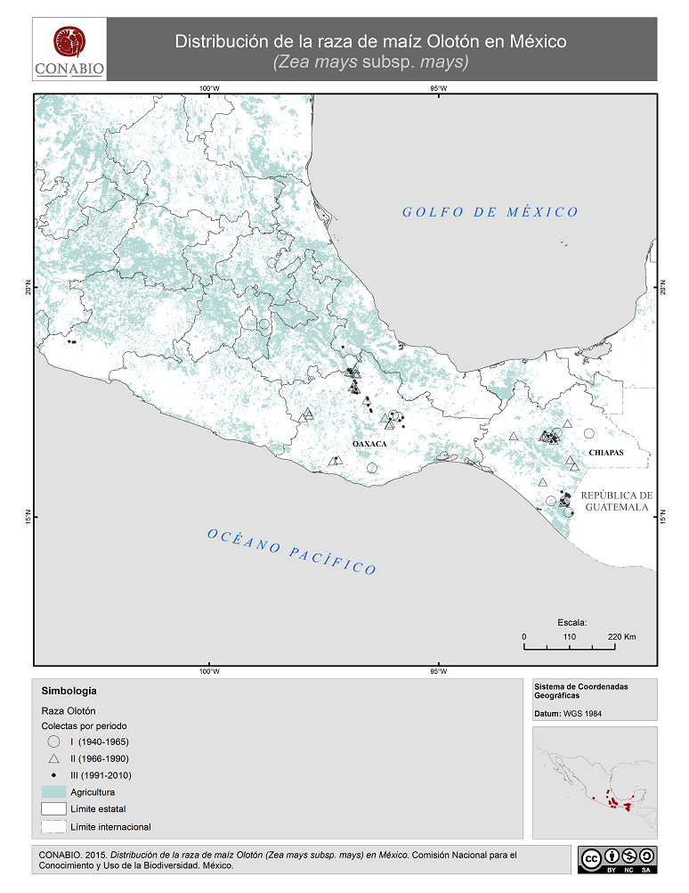 - CONABIO, (2015). 'Olotón en México. Distribución de la raza de maíz', escala: 1:1. Comisión Nacional para el Conocimiento y Uso de la Biodiversidad. Datos obtenidos del Proyecto Global de Maíces Nativos.. México, D.F..