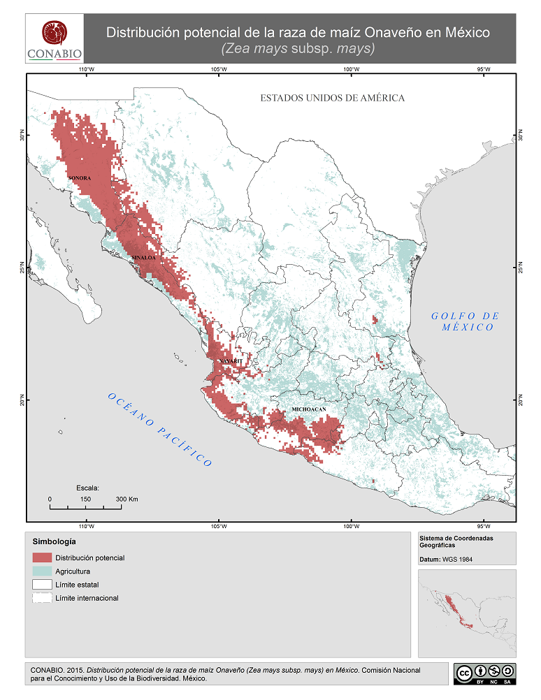 - CONABIO, (2015). 'Onaveño en México. Distribución potencial de la raza de maíz', Comisión Nacional para el Conocimiento y Uso de la Biodiversidad. Se realizó el mapa de distribución de la raza de maíz Onaveño de México, a partir de modelos de distribución potencial realizados por Perales y Golicher en 2011. Dichos modelos fueron generados a partir de los resultados del Proyecto Global de Maíces Nativos, que fue coordinado por la CONABIO junto con el Instituto Nacional de Investigaciones Forestales, Agrícolas y Pecuarias (INIFAP) y el Instituto Nacional de Ecología, ahora Instituto Nacional de Ecología y Cambio Climatico (INECC).. México, D.F..