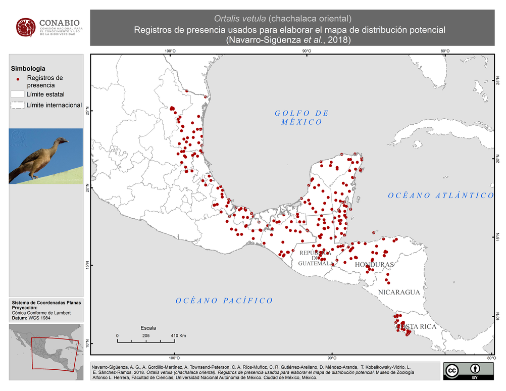 - Navarro-Sigüenza, A. G., A. Gordillo-Martínez, A. T. Peterson, C. A. Ríos-Muñoz, C. R. Gutiérrez-Arellano, D. Méndez-Aranda, T. Kobelkowsky-Vidrio, L. E. Sánchez-Ramos, (2018). 'Ortalis vetula (chachalaca oriental). Registros de presencia usados para elaborar el mapa de distribución potencial', edición: 1. Museo de Zoología Alfonso L. Herrera, Facultad de Ciencias, Universidad Nacional Autónoma de México. Proyecto: JM071, Mapas de distribución de las aves terrestres nativas de Mesoamérica. El Proyecto fue financiado por la Comisión Nacional para el Conocimiento y Uso de la Biodiversidad (CONABIO).. Ciudad de México, México..