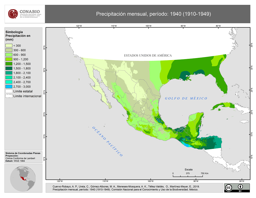 - Cuervo-Robayo A.P., C. Ureta, M.A. Gómez-Albores, A.K. Meneses-Mosquera, O. Téllez-Valdés, E. Martínez-Meyer, (27/08/2019). 'Precipitación mensual, periodo: 1940 (1910-1949)', edición: 1. Instituto de Biología, Universidad Nacional Autónoma de México. Estos mapas forman parte de la publicación: Cuervo-Robayo, A. P., Ureta, C., Gómez-Albores, M. A., Meneses-Mosquera, A. K., Téllez-Valdés, O., y E. Martínez-Meyer. (2020). One hundred years of climate change in Mexico. Plos One. https://doi.org/10.1371/journal.pone.0209808 Ciudad de México, México.